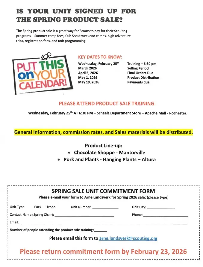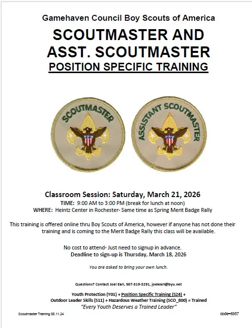 February 25 – Wednesday – Training at 6:30pm @ Scheels Dept Store, Apache Mall in Rochester.